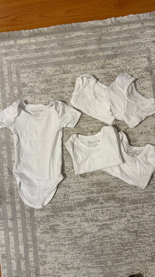 Yumuşak pamuktan yapılmış, kısa kollu beyaz bebek bodyleri, yuvarlak yaka ile rahat ve sade bir tarz sunar. Kesesi ile beraber göndereceğim hiç kullanılmadı beş adet 3/6 ay
