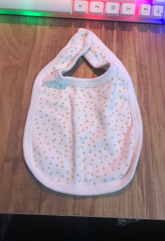 Bu bebek önlüğü beyaz renkte, küçük pastel renkli puantiyelerle süslenmiş, yumuşak kumaştan yapılmıştır ve kullanımı kolay basit bir tasarıma sahiptir.