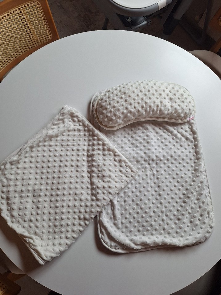 beyaz renkte, kabartmalı nokta desenli yumuşak ve tüylü bebek uyku seti, yastık ve battaniye içerir.