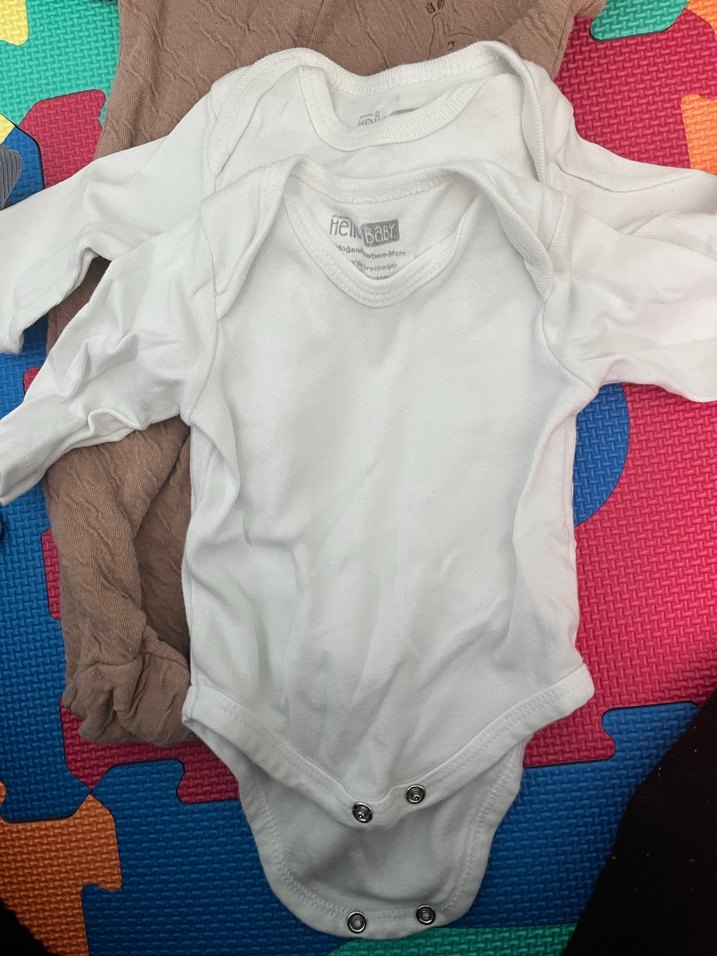 Yumuşak kumaştan yapılmış beyaz uzun kollu bebek zıbını, alt kısmında kolay bez değiştirme için çıtçıtlı kapama bulunur.