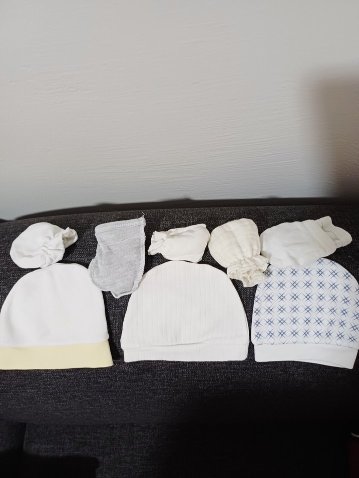 Tekstil malzemeden yapılmış, rahat kullanımlı beyaz ve gri bebek uyku şapkası ile eldiven seti.