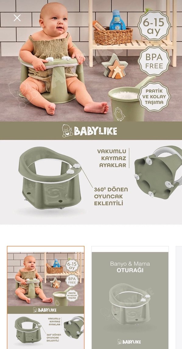 BPA içermeyen, vakumlu kaymaz ayaklara sahip khaki renk bebek oturağı. 360° dönen oyuncak eklenebilir ve pratik taşınabilir. Banyo ve mama için uygundur.