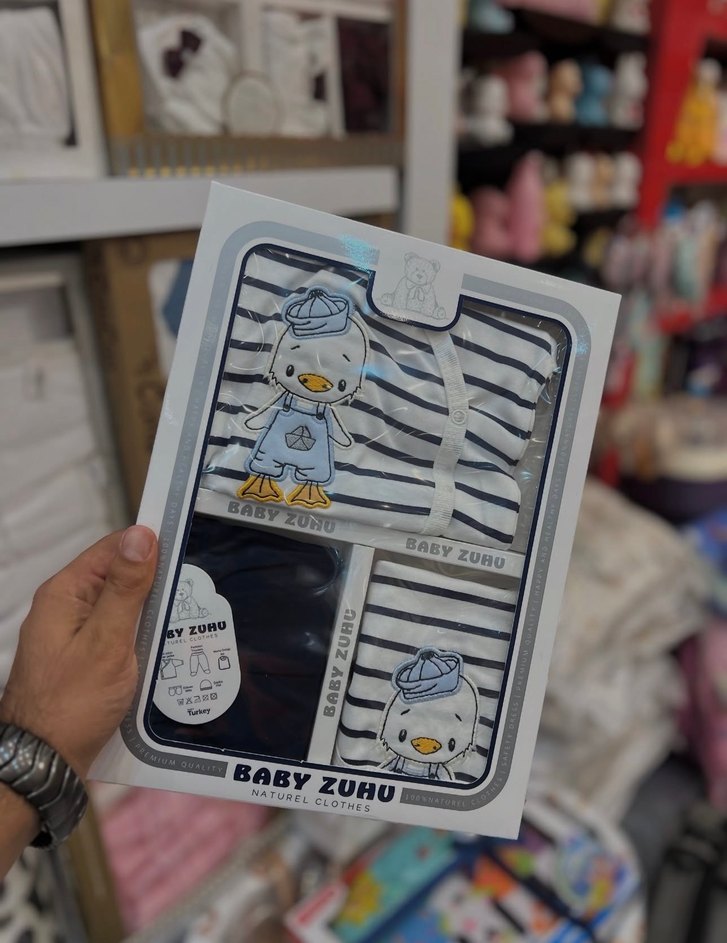 Gri ve beyaz çizgili, sevimli ördek baskılı bebek önlük seti. Bebekler için uygun birden fazla parçadan oluşur.