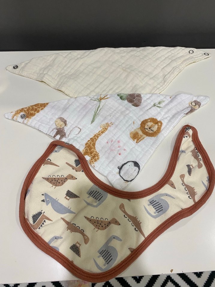 Kahverengi tonlarda hayvan desenli, çıtçıtlı üçlü bebek önlük seti. Üç önlük birlikte satılık kahverengi rengi olan pamuklandı çok kullanıldı ama diğerleri iyi durumda