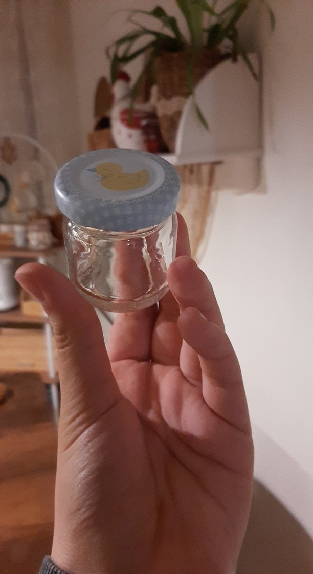 Pastel mavi kapaklı, sarı ördek figürlü küçük cam bebek şişesi. Beyaz renkte ve kolay tutulabilir boyutta.
