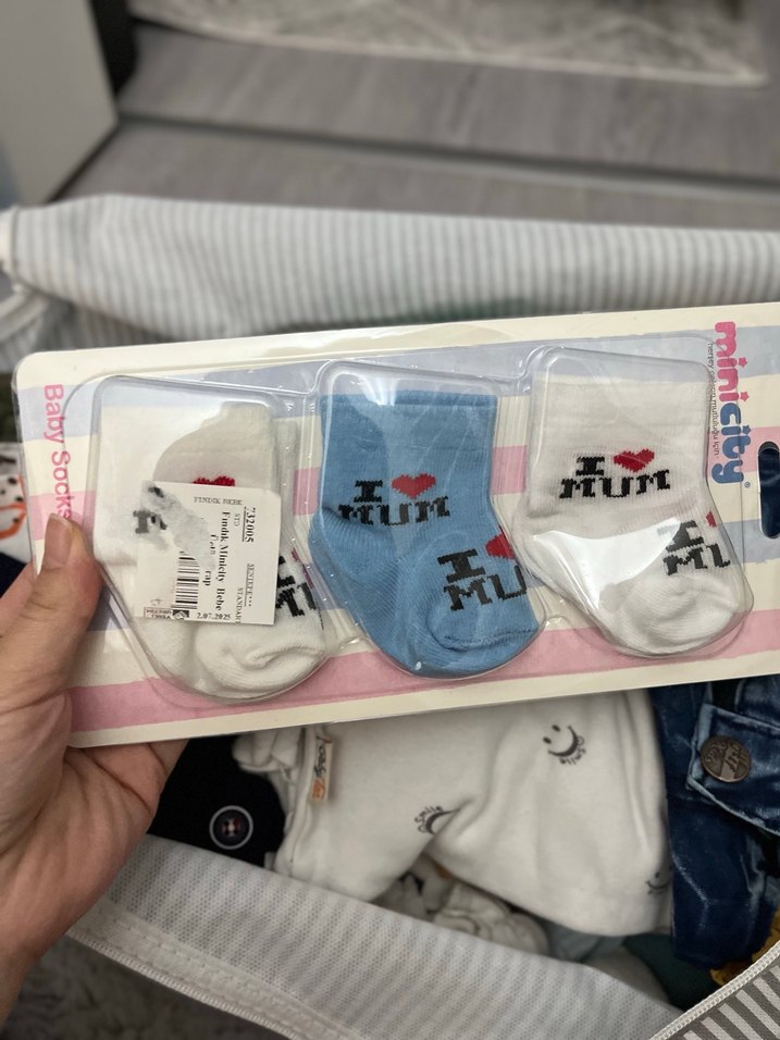Pastel mavi renkli, baskılı 'I ♥ mum' deseni bulunan bebek çorapları, yumuşak ve rahat bir kullanım sunar. Paket içinde üç çift vardır. Yeni doğan 5 aya kadar kullanılır