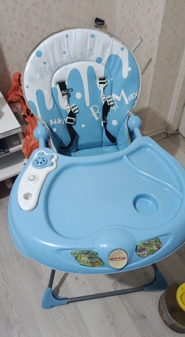 Ayarlanabilir kayışlara ve bardak tutucu ile oyuncak aparatı bulunan tepsiye sahip açık mavi bebek mama sandalyesi. Rahat ve güvenli beslenme için. görüldüğü gibidir urfa içi elden teslim edilir sağlam