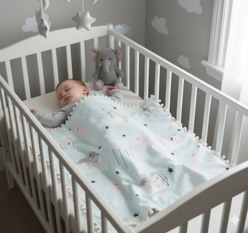 Bebekler için yumuşak ve sıcak pastel renkte, desenli battaniye ve yastık kılıfı Rahatlık ve konfor sağlar. ️