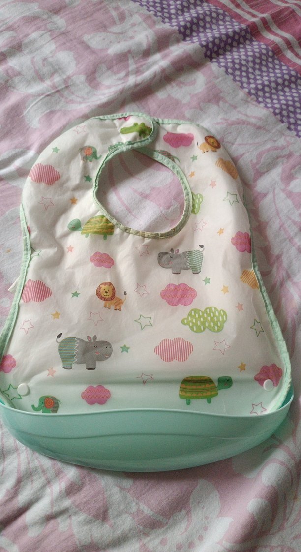 Pastel yeşil renkte, hayvan ve bulut desenli baskılı bebek önlüğü. Yuvarlak yaka ve döküntüleri toplayan cep bulunur.
