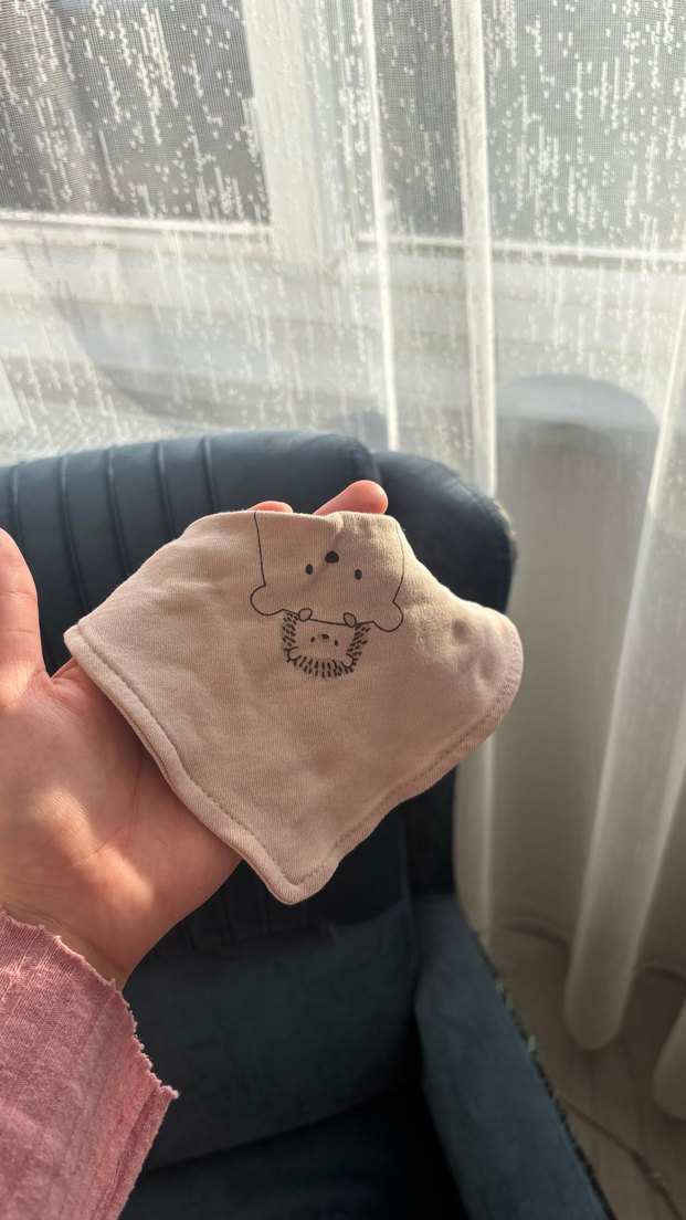 Bej renkli, yumuşak kumaştan yapılmış ve üzerinde basit hayvan baskısı bulunan bebek önlüğü.