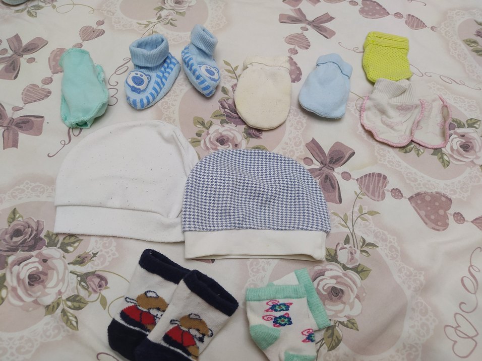 Beyaz ve açık mavi tonlarda, yumuşak tekstil eldiven, çorap ve şapkalardan oluşan pastel renkli bebek uyku aksesuarları seti.