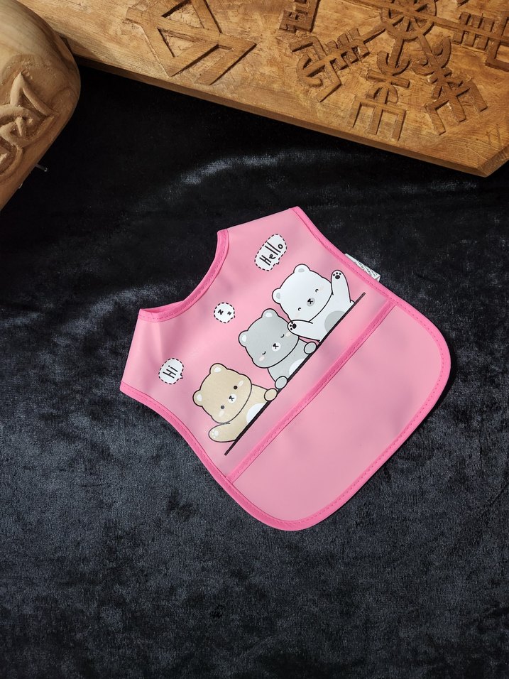 Önde cepli, üç sevimli ayıcık baskılı pembe bebek önlüğü. Yumuşak ve kolay temizlenen kumaştan üretilmiştir.