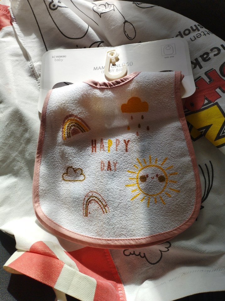 Bebek önlüğü, pastel renklerde baskılı gökkuşakları, bulutlar ve güneş deseni içerir. Yumuşak dokulu ve pembe kenarlıklıdır. ☀️