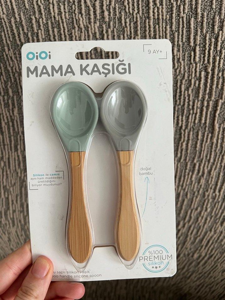 9 ay ve üzeri bebekler için yumuşak silikon başlıklı, bambu saplı iki mama kaşığı seti. %100 premium silikon ve doğal bambudan üretilmiştir. ️