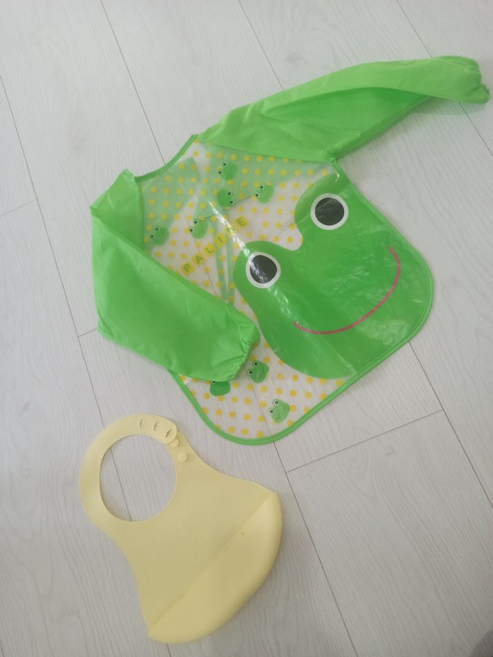 Uzun kollu, kurbağa desenli renkli bebek önlüğü ve sarı silikon önlük seti. Yemek sırasında kıyafetleri korur.