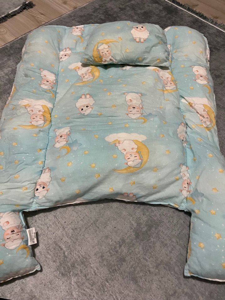 Pastel gri renkte, yumuşak ve sıcak kumaştan yapılmış baskılı bebek uyku minderi, çocuklar için konfor ve destek sağlar.