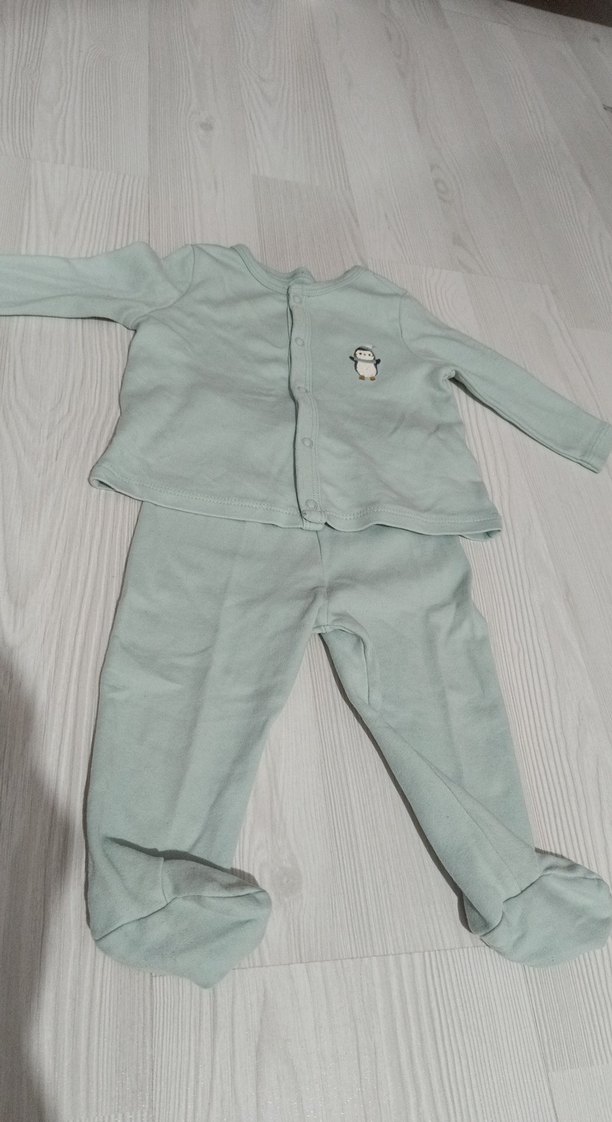 , uzun kollu ve düğmeli bebek hastane kıyafeti. Yumuşak ve sıcak kumaştan, ayaklı pantolonlu ve küçük penguen detaylı.