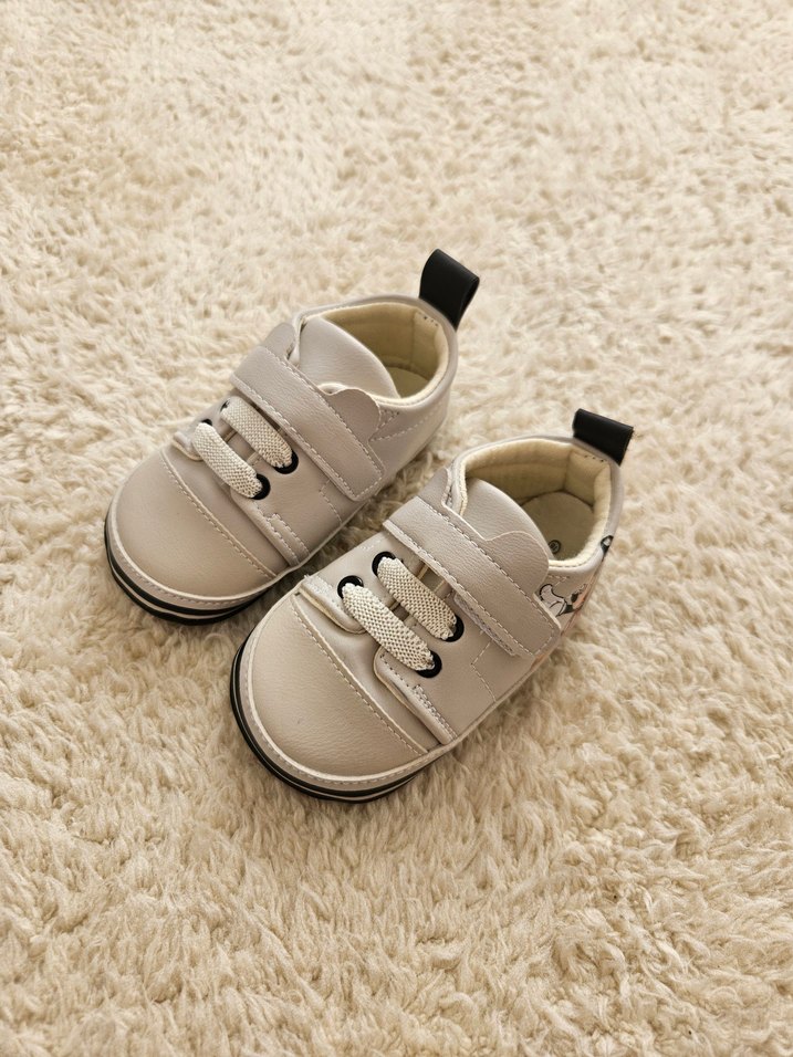 Beyaz renkli, lastik tabanlı ve cırt cırtlı erkek bebek ilk adım ayakkabısı. Sade sokak stili ve rahat kullanım sunar.