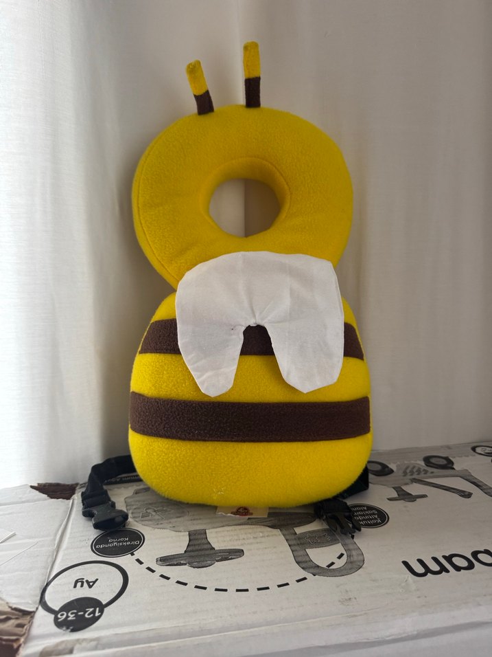 Yumuşak kumaştan yapılmış, sarı ve renkli çizgili arı figürlü peluş yastık emekleme yürüme çağındali bebeklerin başını ve boynunu nazikçe destekleyerek düşme ve çarpma risklerine karşı ekstra koruma sağlar.Hafif ve küçük boyutlu olması sebebiyle kolay taşınır. Ayarlanabilir omuz askısıyla bebeğe göre ayarlanabilir. Şapka bile takmak istemeyen bebeğim ensesine sırtına bişey değmesini sevmediği için kullanamadık. Marka temsilidir.