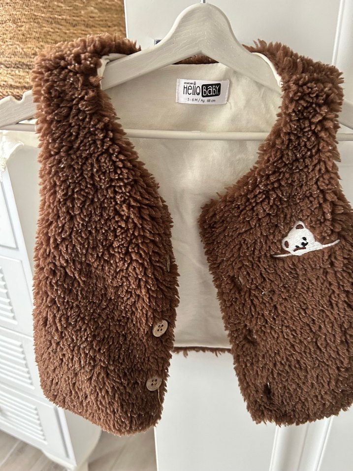 Kahverengi, kolsuz, notched lapel yaka ve gri nakış detaylı Bebek yeleği . Yumuşak ve sıcak fleece kumaştan, vücuda oturan kesimde.