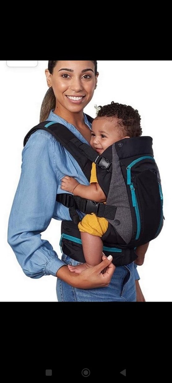 Siyah ve gri renkli bebek taşıyıcı, ayarlanabilir askılar ve güvenli tokalar ile rahat taşıma sağlar. bel desteği güzel Bebek öne veya içe bakacak şekilde taşınabilir, küçük fermuarlı 4 cep içerir.