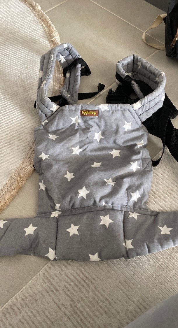 Yıldız desenli gri bebek taşıyıcı, yumuşak dolgulu askılar ve ayarlanabilir tasarıma sahip. Bebeklerin güvenli taşınmasını sağlar. ⭐ bir kez taktım sadece