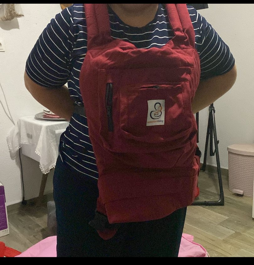Bordo renkli bebek taşıyıcı, yumuşak omuz askıları ve fermuarlı ön cep ile konforlu taşıma sağlar.