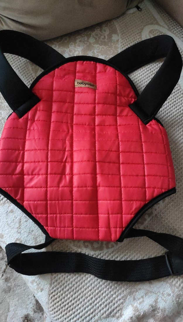 Koyu kırmızı renkli, dolgulu kumaş ve ayarlanabilir siyah askılarla rahat ve güvenli bebek taşıyıcı.