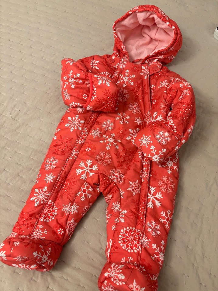 Kapüşonlu, fermuarlı kırmızı bebek tulumu, beyaz kar tanesi desenleriyle süslenmiş. Bebeğinizi sıcak tutar. ❄️6/9 ay 68/74 cm iki kol arası 37 cm boy 61 cm yeni içi polarlı