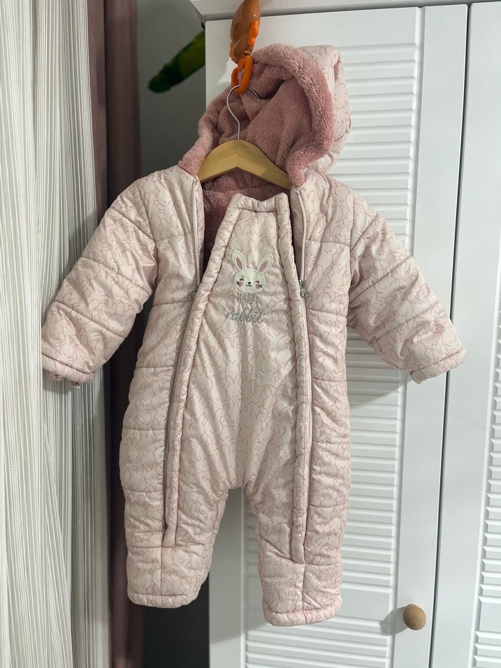 Pastel pembe renkli bebek tulumu, kürklü kapüşon ve nakışlı tavşan desenine sahiptir. Notlu yaka ve kapitone dokusu ile sıcak tutar.