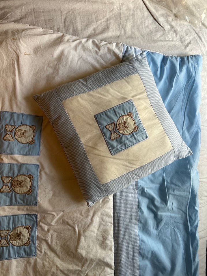 Mavi ve pastel tonlarda, yumuşak tekstil malzemeden yapılmış Çilek marka full karyola seti 2 yan 1 baş yan koruma Yorgan Lastikli çarşaf Yastık 2 süs yastık Yorganda çok hafif lekeler var onun dışında bir problem yok