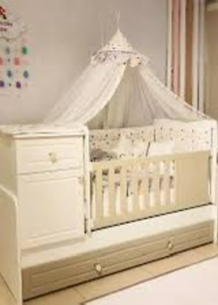 Kanz bebek odası. Karyola büyüdüğünde tek kişilik yatak olarak kullanılıyor karyoladan çıkan parçalar masa oluyor internetten araştırabilirsiniz karyolanın altında yavru yatak yeri var çekmeceli çektiğinizde içine yatak koyabilirsiniz tek kişilik iki çocuk için veyatta misafir için uygundur.