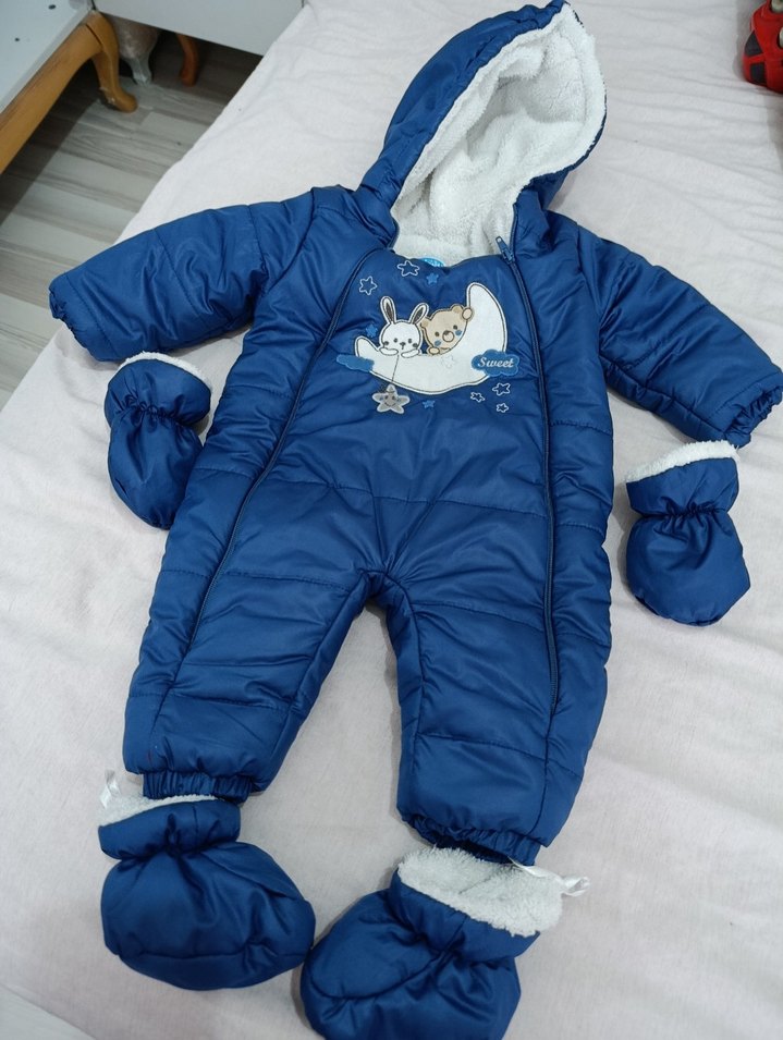 Renkli nakışlı, kapüşonlu ve kürklü mavi bebek kayak tulumu. Soğuk havalar için yumuşak ve sıcak kumaşlıdır. bir sorunu yoktur