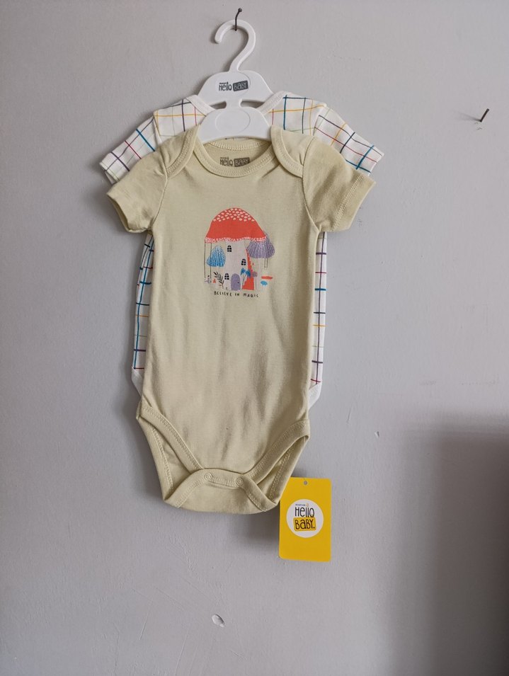 Bebeğe özel kısa kollu, yuvarlak yakalı ve pamuklu bej renkli baskılı body, rahat ve şık sokak stiline uygun.