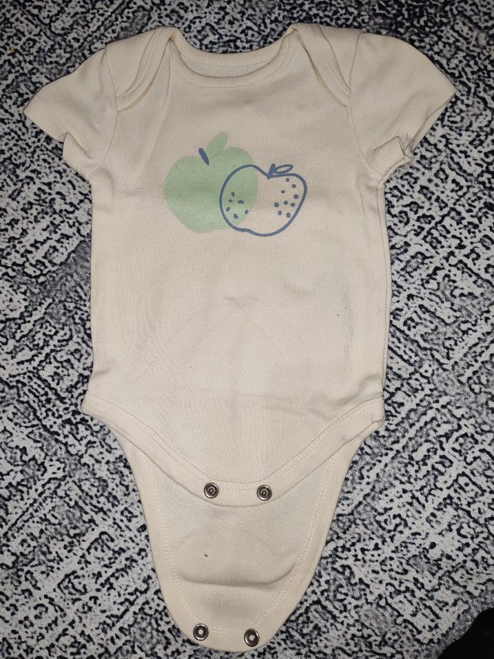 Beyaz renkli, kısa kollu bebek bodysi, önünde pastel renklerde elma baskısı vardır. Alt kısmında kolay değiştirme için düğmeler bulunur.