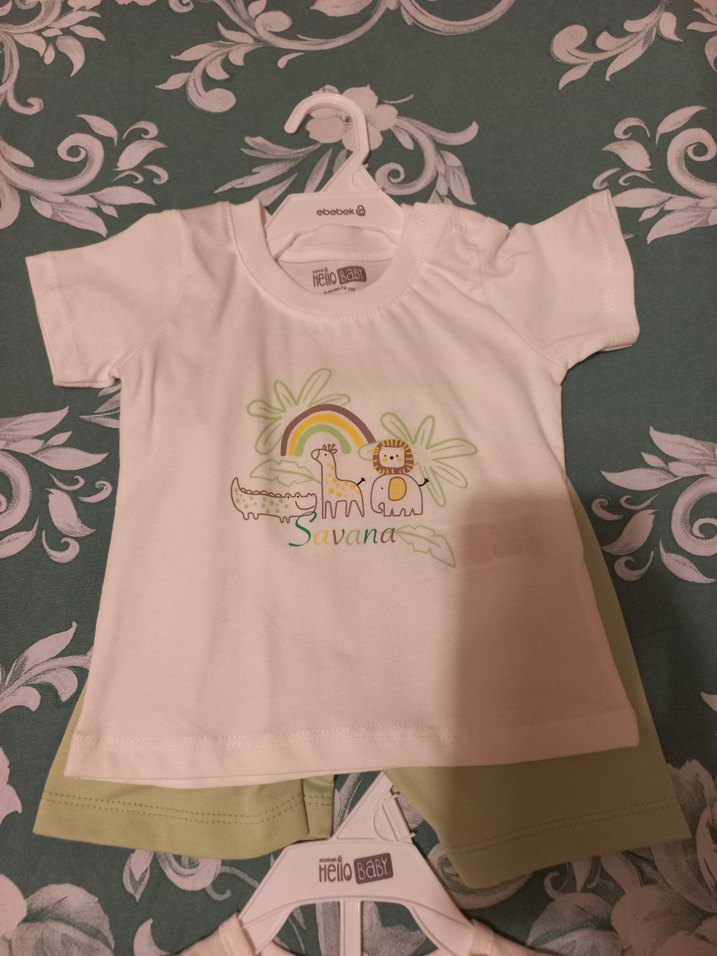 Pamuklu kısa kollu, bisiklet yaka üst ve pastel yeşil şortlu bebek erkek takımı. Üstte renkli safari baskısı bulunur sıfır ürün