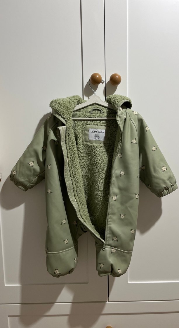 Çiçek desenli, fermuarlı yeşil bebek kış tulumu. Notlu yaka ve yumuşak, sıcak iç astar içerir. ❄️