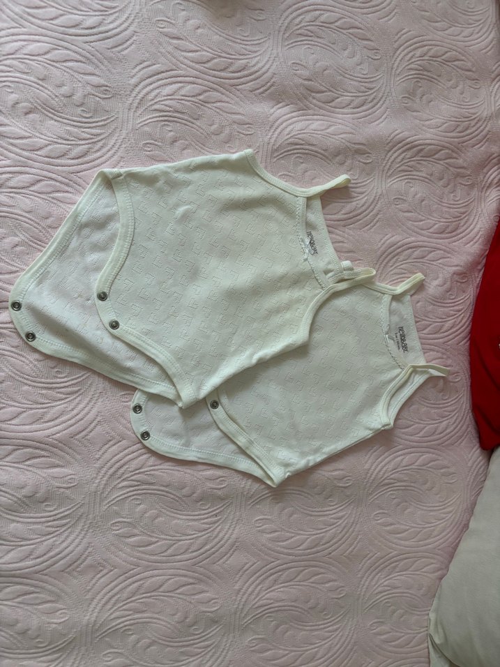 Askılı, beyaz pastel renkli bebek kız bodysi. Çıtçıtlı ve straplez yakaya sahip, yumuşak ve rahat kumaş.