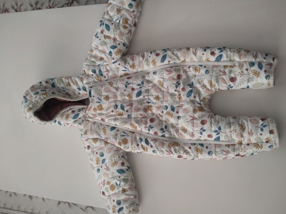 Bebek kız için pastel renklerde baskılı beyaz tulum, yakalı ve kürk detaylıdır.bir kez giyildi küçük geldiği için satışta yoksa kalitesi herşeyi çok güzel