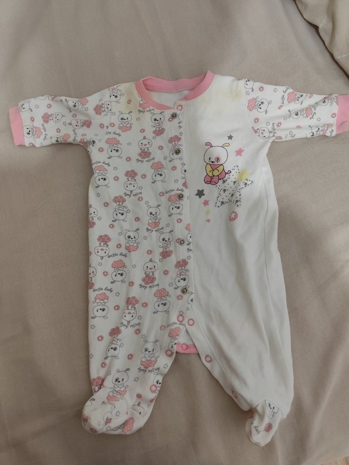 Bebek kız tulumu, pastel beyaz renkte, baskılı desenli ve kolay giydirme için düğmeli tasarıma sahiptir.