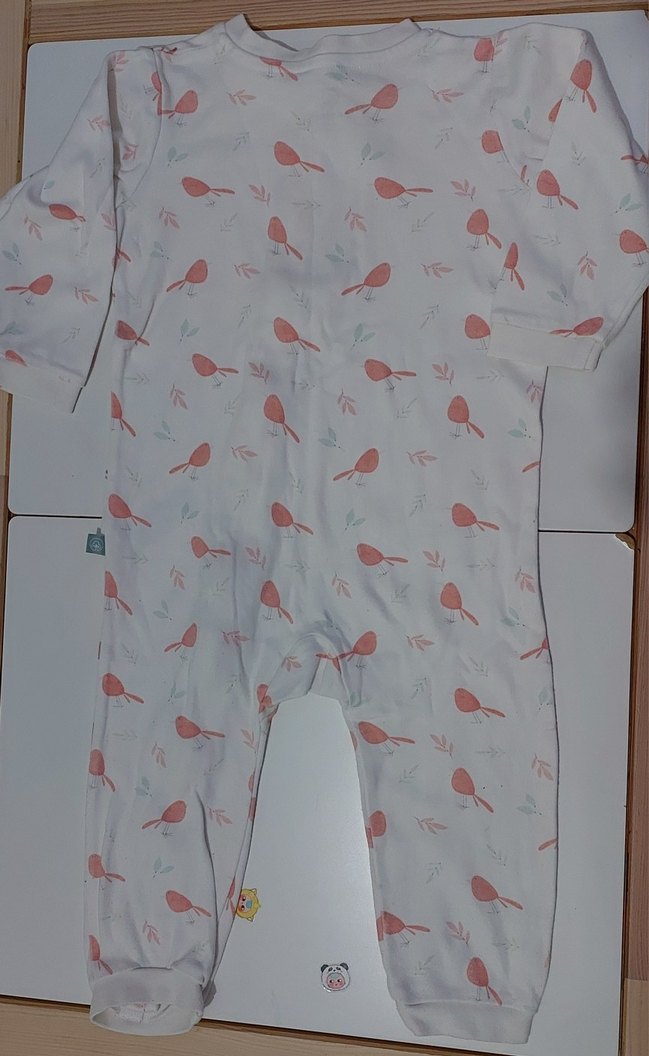 e bebeğin organik ürünüdür. Pastel renkli, baskılı kuş desenli ve düğmeli, yumuşak kumaştan yapılmış bebek kız tulumu.