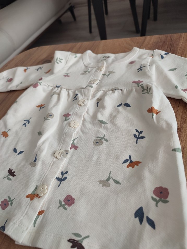 Bebek kız için pastel beyaz renkli, baskılı çiçek desenli uzun kollu düğmeli üst ve küçük cepli pantolon takımı.