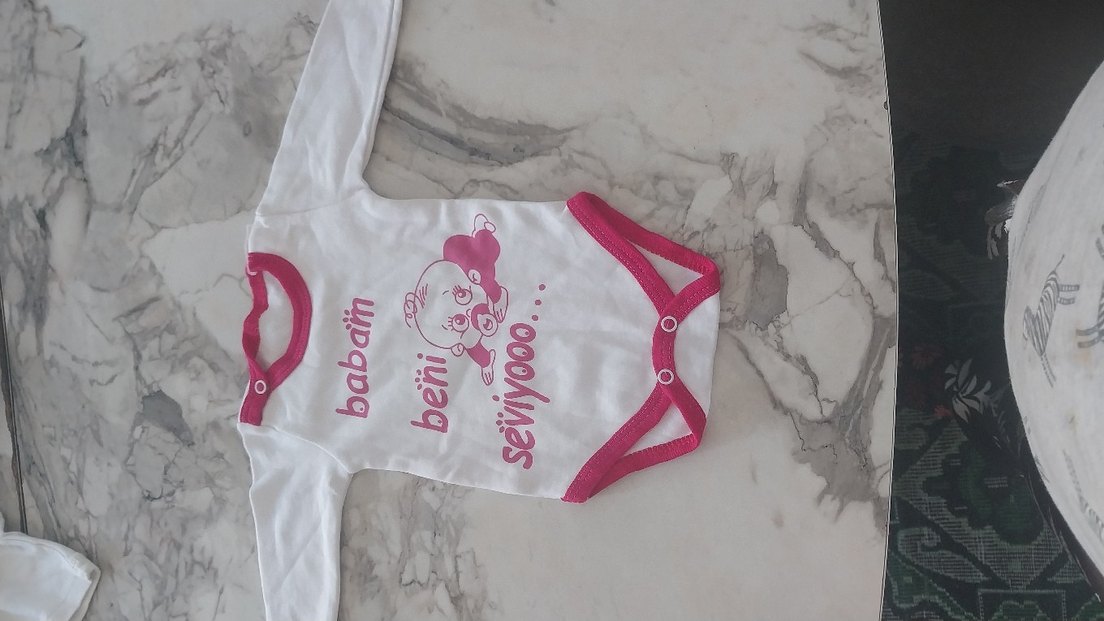 Pastel pembe baskılı, kısa kollu ve yuvarlak yakalı bebek kız body, kolay giydirme için cırt cırtlı kapama ile.