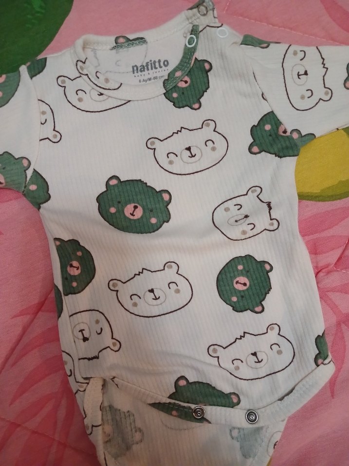Pastel beyaz, baskılı ayıcık desenli, kısa kollu, yuvarlak yakalı ve düğmeli bebek kız body. Marka: nafitto.