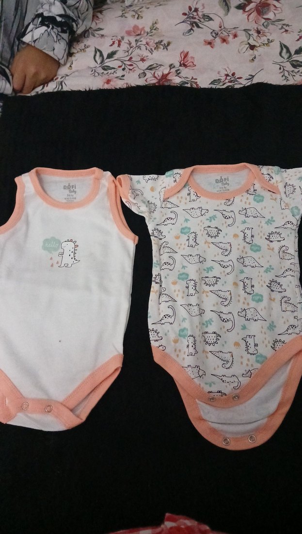 İki adet kolsuz bebek kız body seti, pastel renklerde dinozor baskılıdır. Yumuşak kenar detayları ve çıtçıtlı kapanışa sahiptir.
