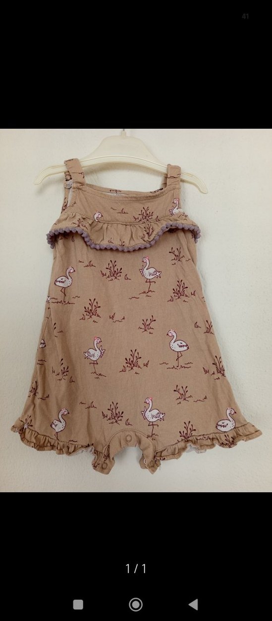 Bej renkli, pastel flamingo desenli bebek kız tulumu. Göğüs ve paça kısmında fırfır detayları bulunur. Ayarlanabilir askılı ve yumuşak kumaş.
