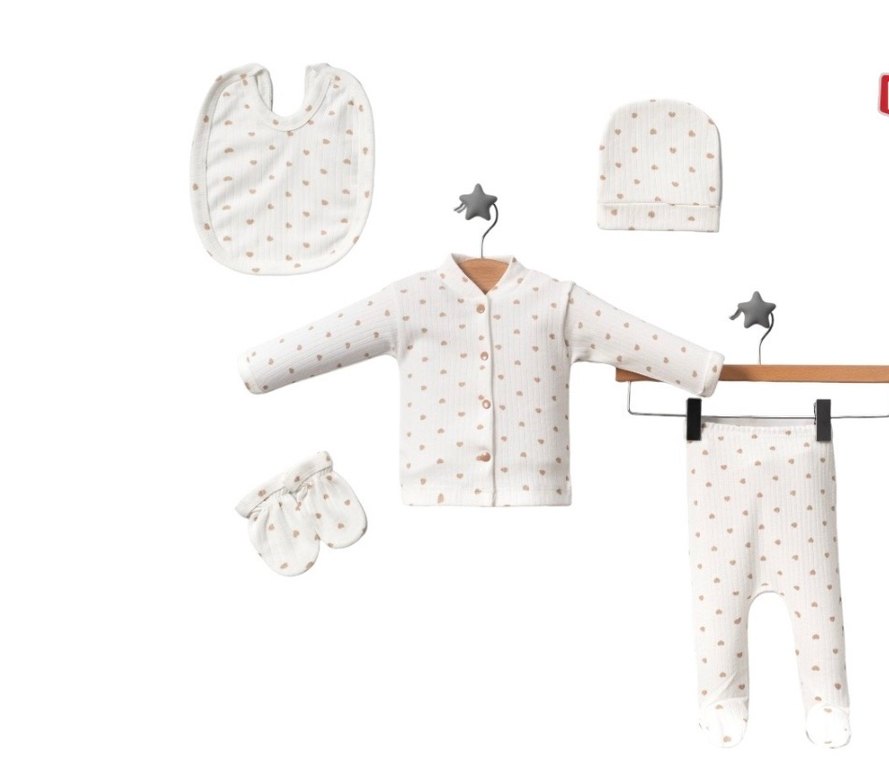 Kutulu şekilde gönderilecektir.Beyaz renkli, uzun kollu hırka, şapka, eldiven ve önlükten oluşan bebek kız kıyafet seti. Yumuşak ve rahat malzeme kullanılmıştır.