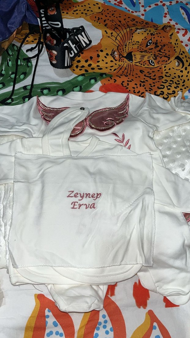 Beyaz renkte, baskılı ve fermuarlı bebek kız hastane kıyafeti. Üzerinde "Zeynep" ve "Erva" isimleri işlenmiştir.