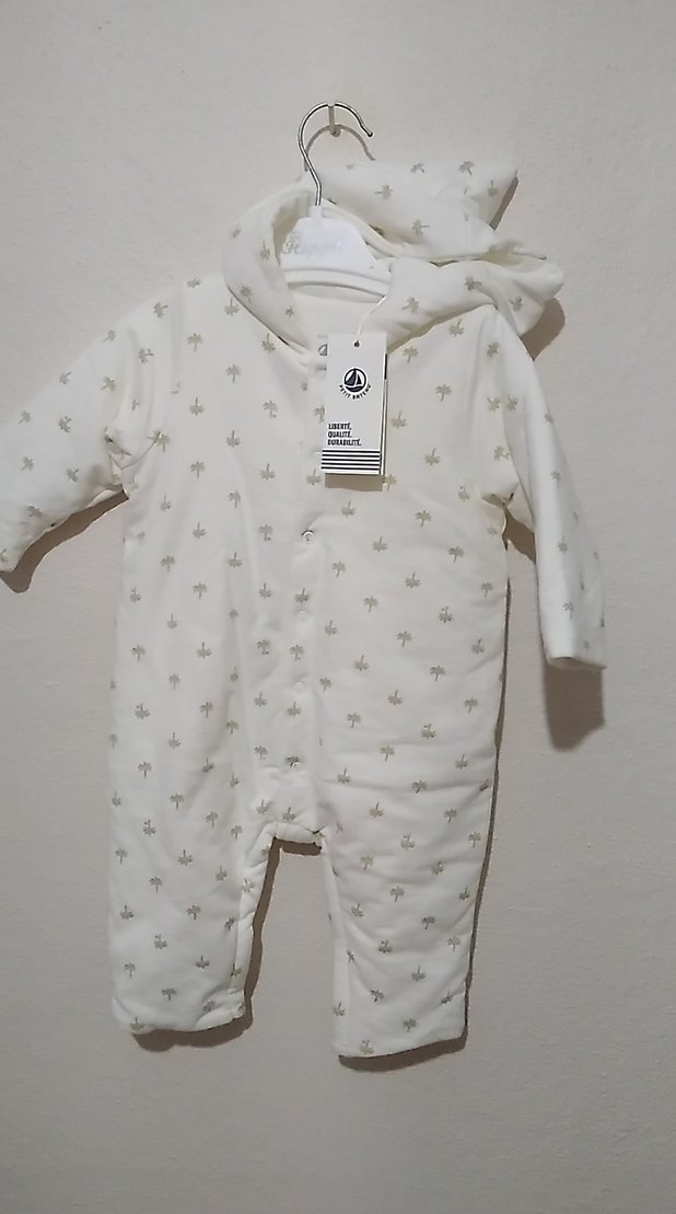 Bebek kızlar için düğmeli, beyaz zemin üzerine pastel desenli ve bisiklet yaka tulum. Soğuk havalar için uygun ve rahat bir seçim. ❄️6,9 ve 12 ay için uygundur