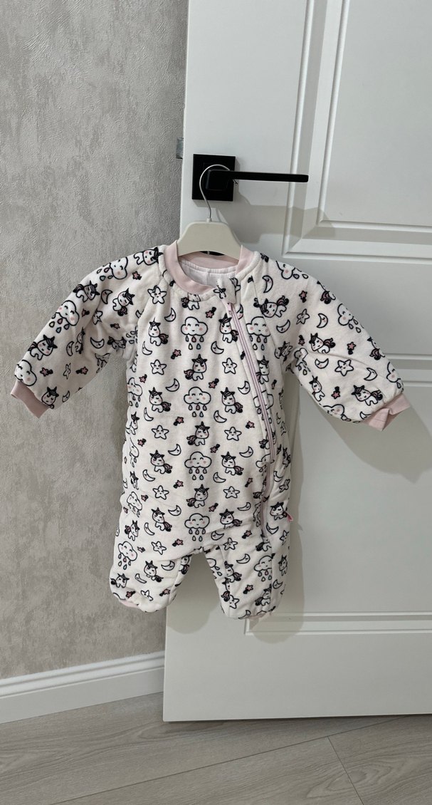 Bebek kız tulumu, pastel beyaz zemin üzerine desenli. Bisiklet yaka ve önden fermuarlı tasarıma sahip. ❄️